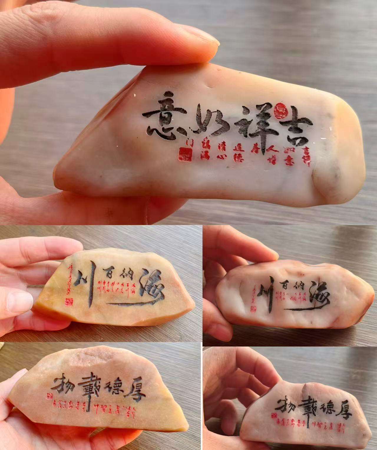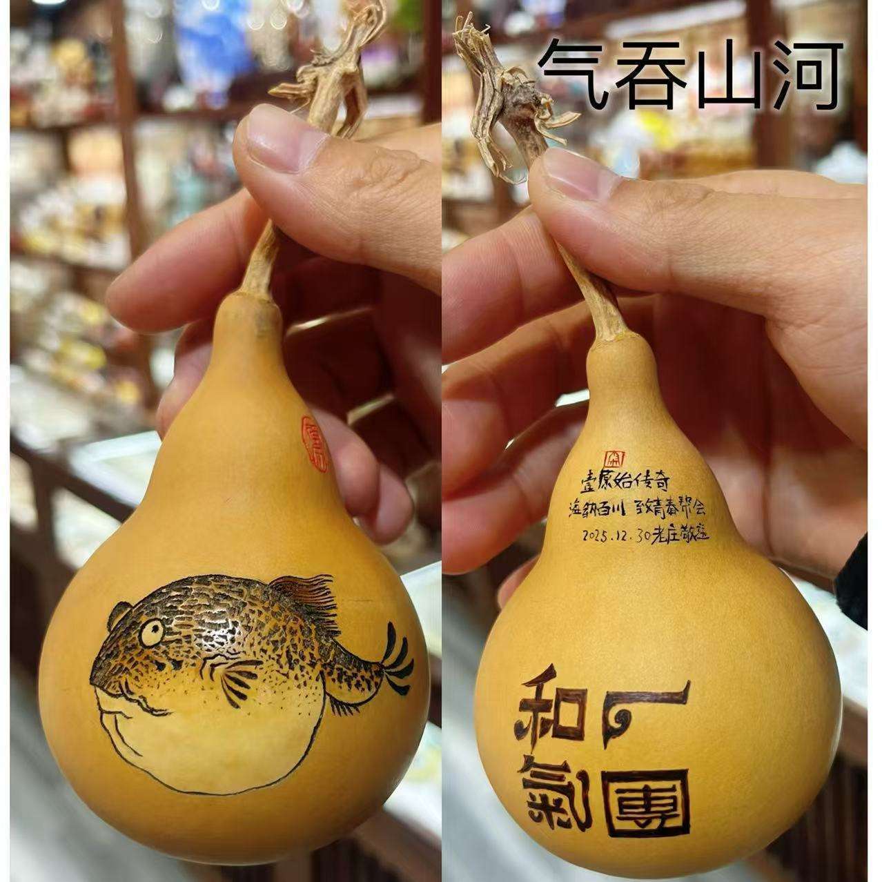 采购过程,出了点小插曲,一等奖这里直接严重超标了,本打算是1000元宝左右安排的一等奖,逛街过程直接看到一个极品手工烙葫芦,我觉得非常好看,而且特别合适。(图案是一条河豚,河豚应急时会鼓成小气球,老板在葫芦上书“一团和气”的字,并且河豚还有“气吞山河”的寓意,觉得作为帮派奖品很好。可以放在柜子里,也可以盘,日后如果养起来包浆会更好看)。最终老板看我很想要又不愿意降价(因为工艺很费劲),最终答应给我在葫芦上面加字。于是我加上了帮派的字样和时间。所以一等奖直接造价就超过了白骨玉。二等奖也是文创类的,几个石头做的工艺品,有两个有“海纳百川”的字,放在书桌电脑桌或者茶桌都不错。三等奖安排了祝福油,四等奖安排了生命项链(好歹是个小射线)。一二等奖特地安排了“包邮到家”。