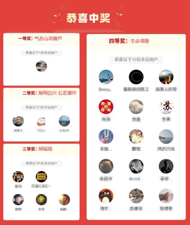 奖品数量上经过考量决定设置一位锦鲤拿大奖,二等奖三个,三等奖6个,前面10位幸运儿嗨一些,尤其是一等奖。然后四等奖设置了15位,起码起码是有个射线。其他参加又没中奖的帮友有一定的金币奖励。