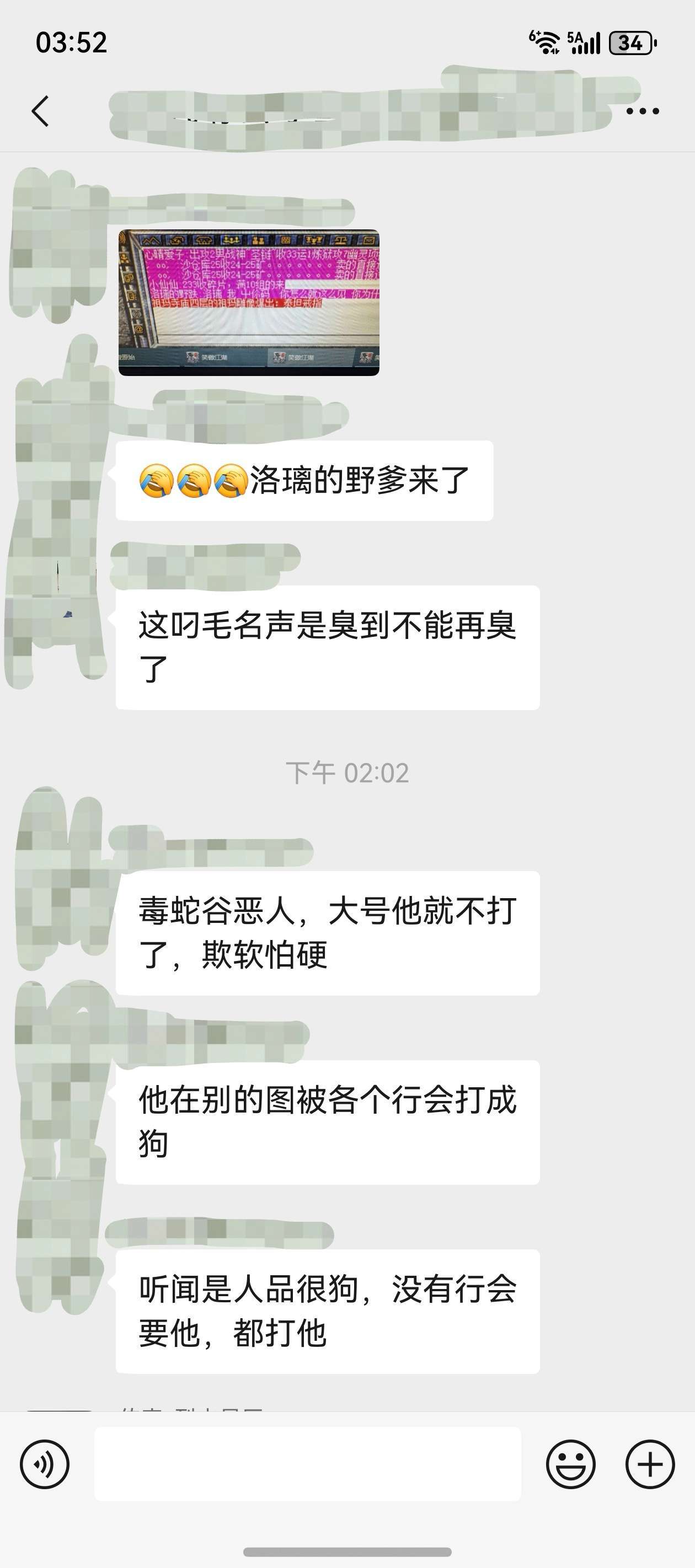 此人49道士号ID洛璃、战士号小辰、索尼。每天都在毒蛇山谷游荡,欺负散人小号,大号不敢(怕被打欺软怕硬,欺善怕恶,败类中的败类)。经常抢怪,无缘无故打人。在山谷里也是人人唾弃,没想到今天在群里看到爆料,也是意料之中,这种LJ也只有在山谷欺负欺负散人、小号了。